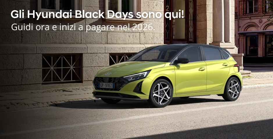 Con gli Hyundai Black Days scegli la tua nuova Hyundai e inizi a pagare la prima rata dopo 90 giorni. Un vantaggio concreto per metterti subito al volante, con più serenità e flessibilità.